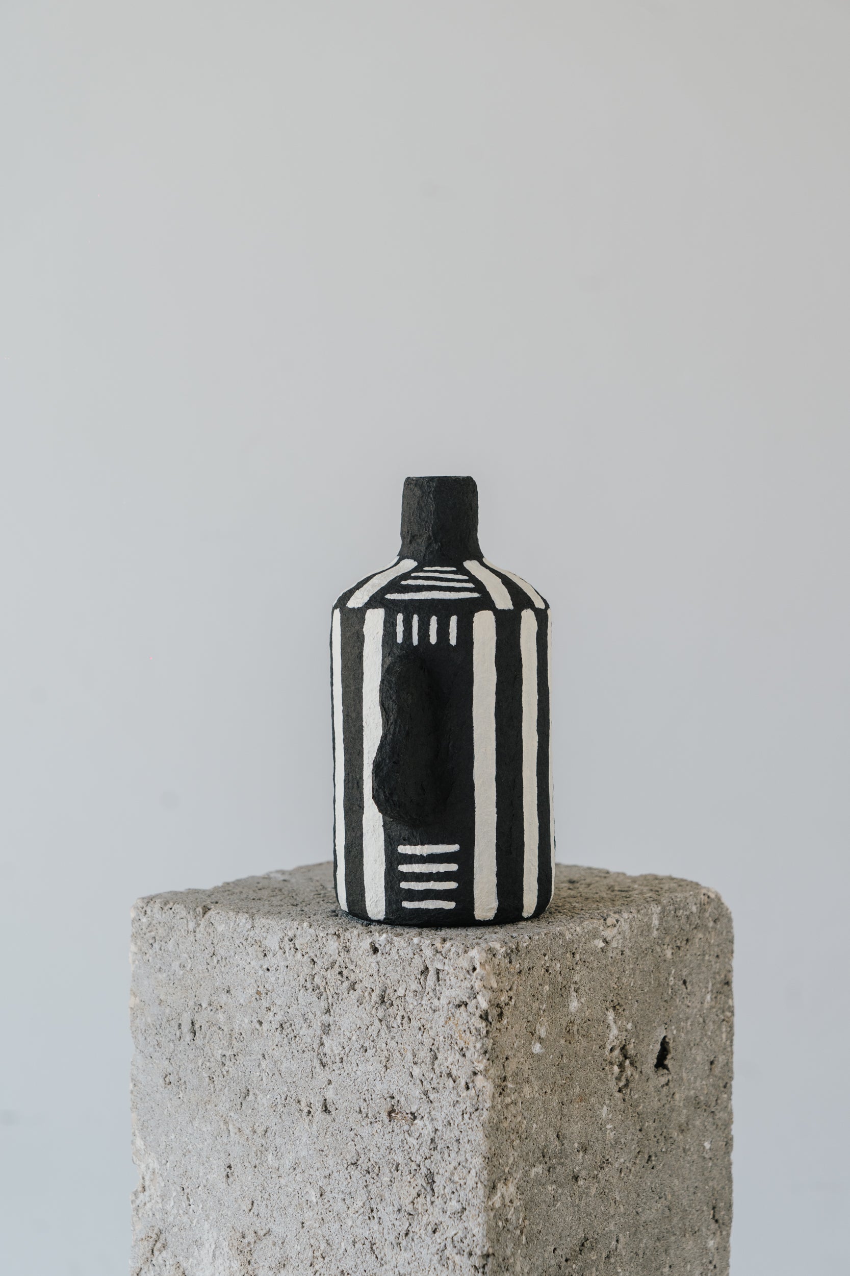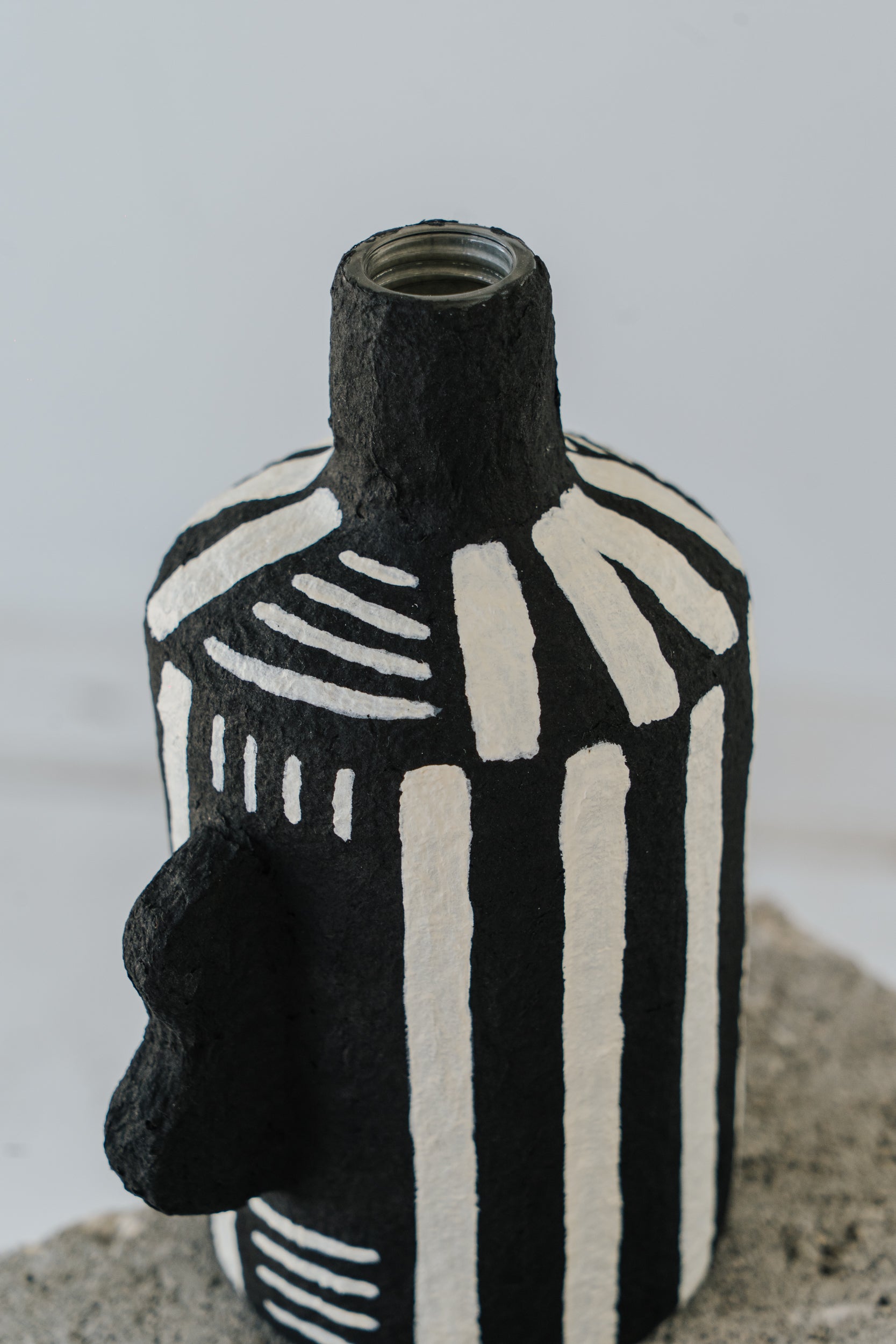 Striking and sculptural, this one-of-a-kind vase is handcrafted from an upcycled liquor bottle and recycled paper waste — transformed into a bold monochrome statement piece. Painted in matte black with hand-drawn white stripes, it combines raw texture with graphic elegance.