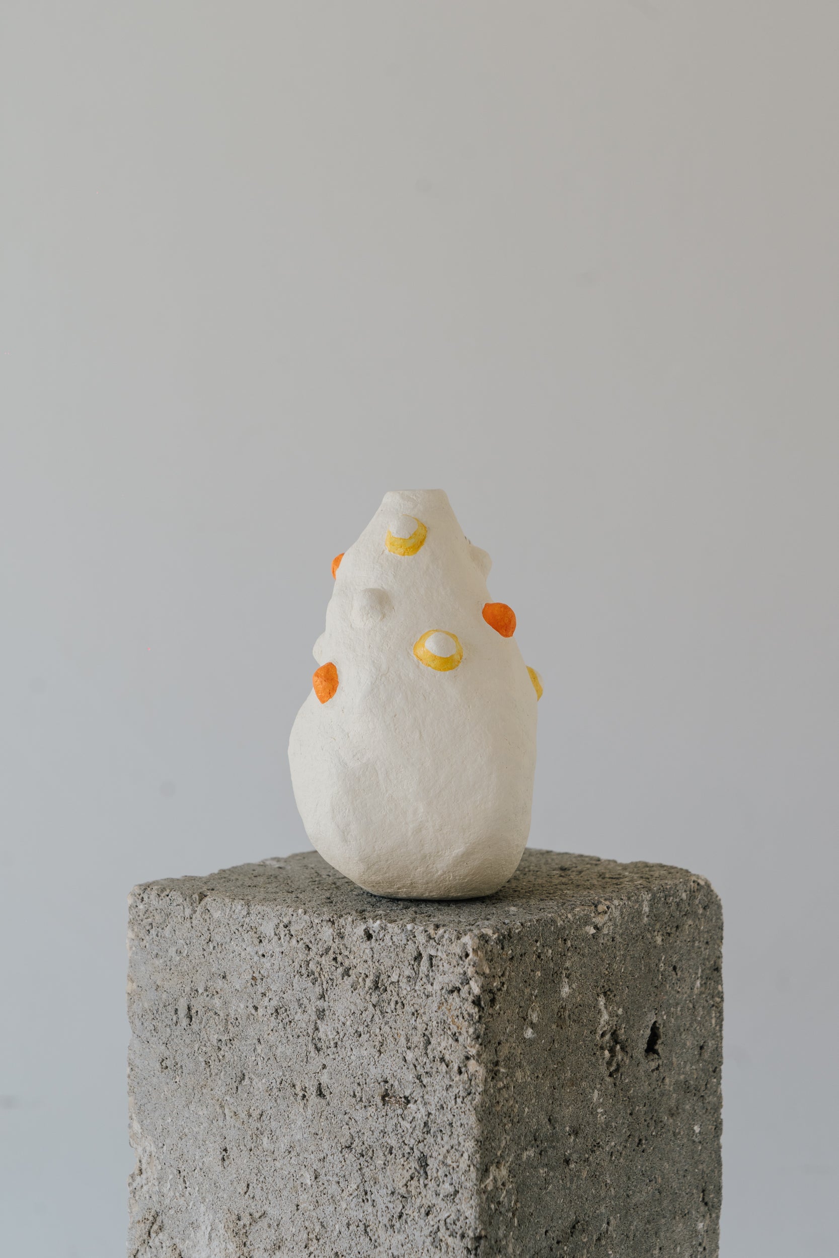 Minimalist yet bold, this one-of-a-kind vase is handcrafted from an upcycled glass bottle and recycled paper waste — including invoices, scrap paper, and egg cartons — then hand-painted in a natural white with striking pink star shapes.