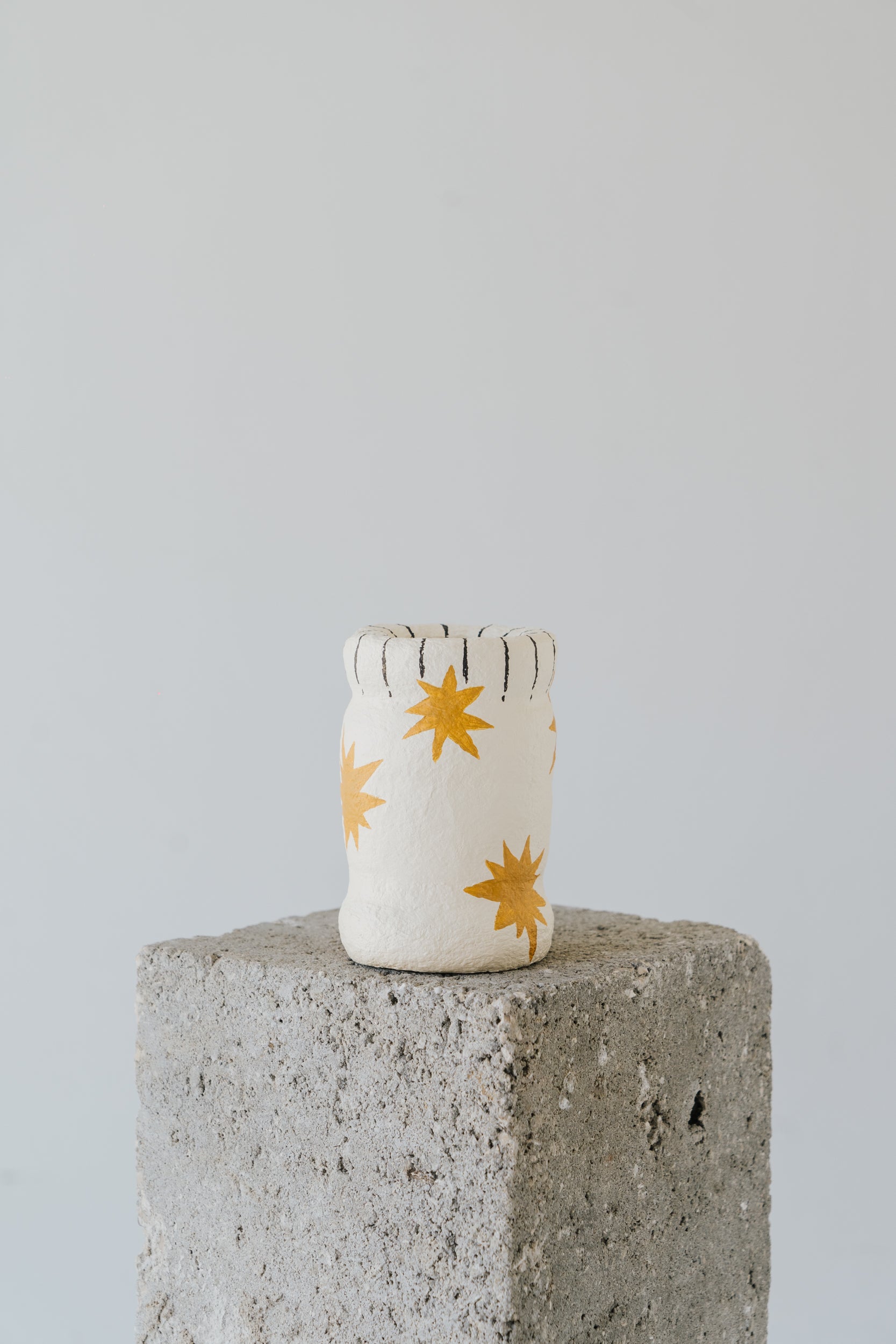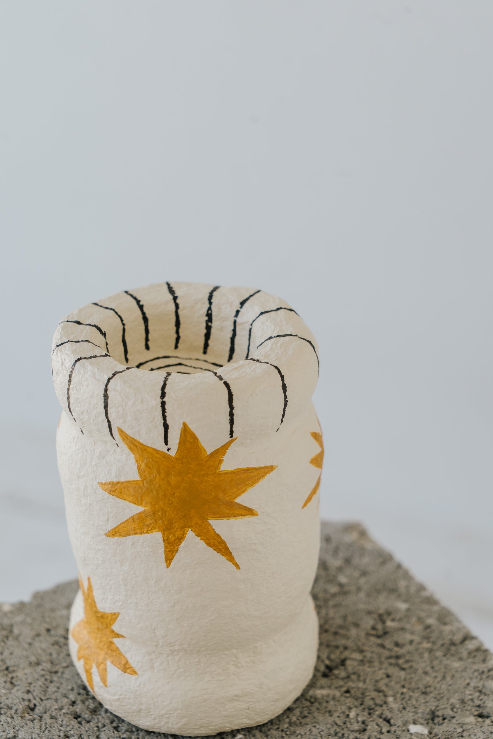 Handcrafted from recycled daily waste, shaped with papier-mâché and painted with acrylics, this tea light holder is a one-of-a-kind creation. Measuring 12 cm tall, it carries golden star motifs that bring a cosmic warmth to your space.