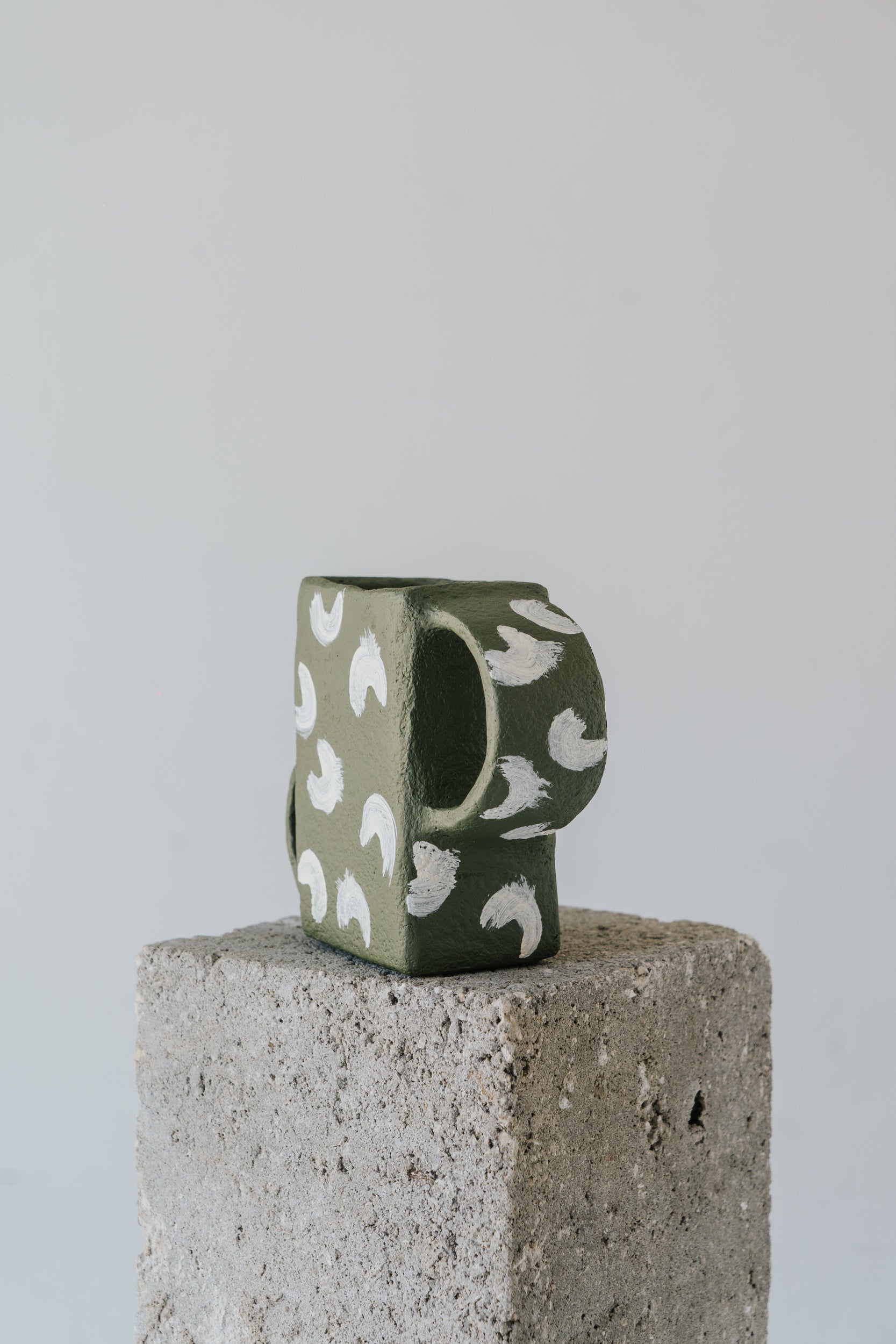Playful and organic, the Organic Flow Vase is handcrafted entirely from recycled paper pulp, shaped over an upcycled milk carton. Its sculptural square body with double handles is painted in earthy green and decorated with free-flowing white brushstrokes, evoking the movement of nature and growth.