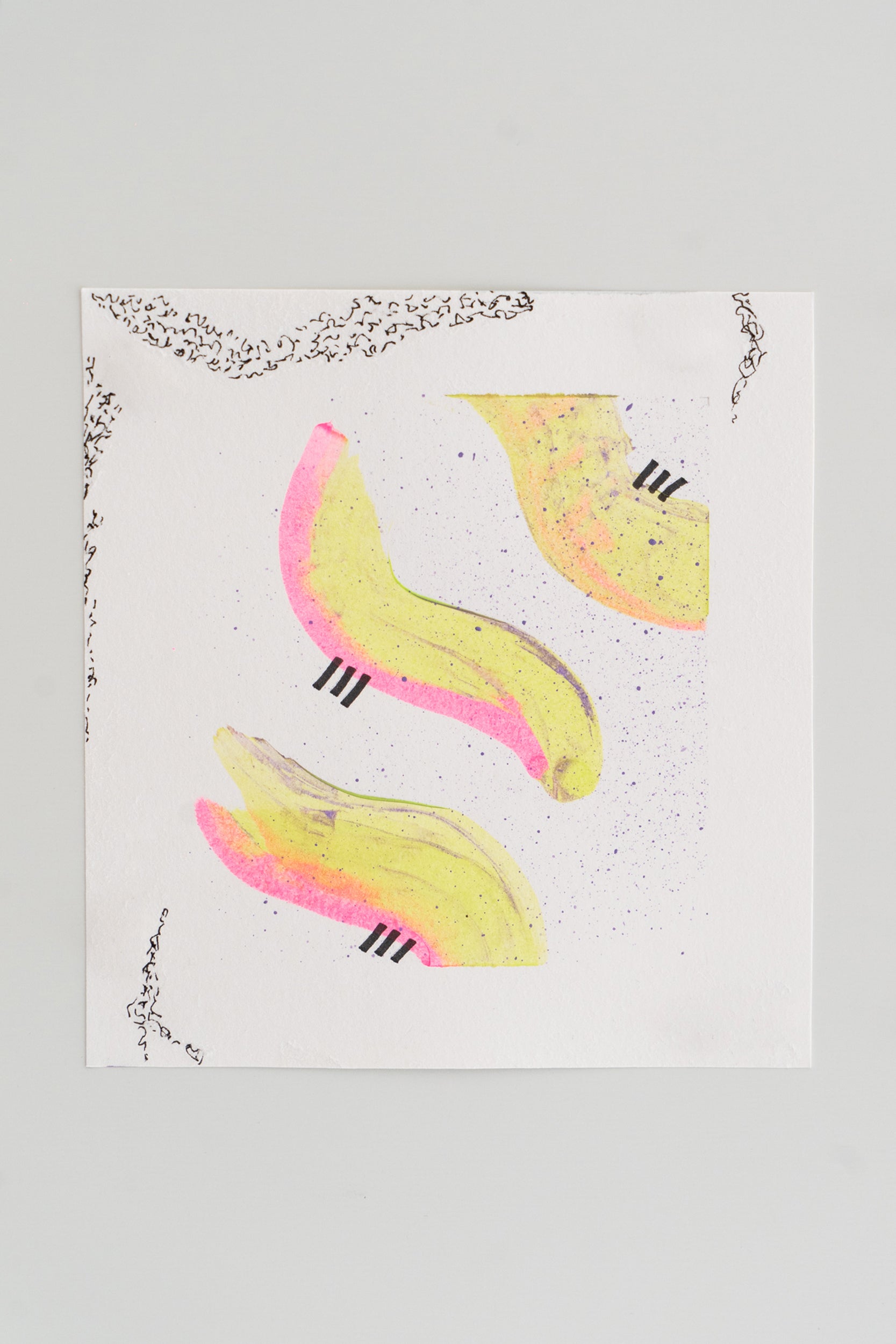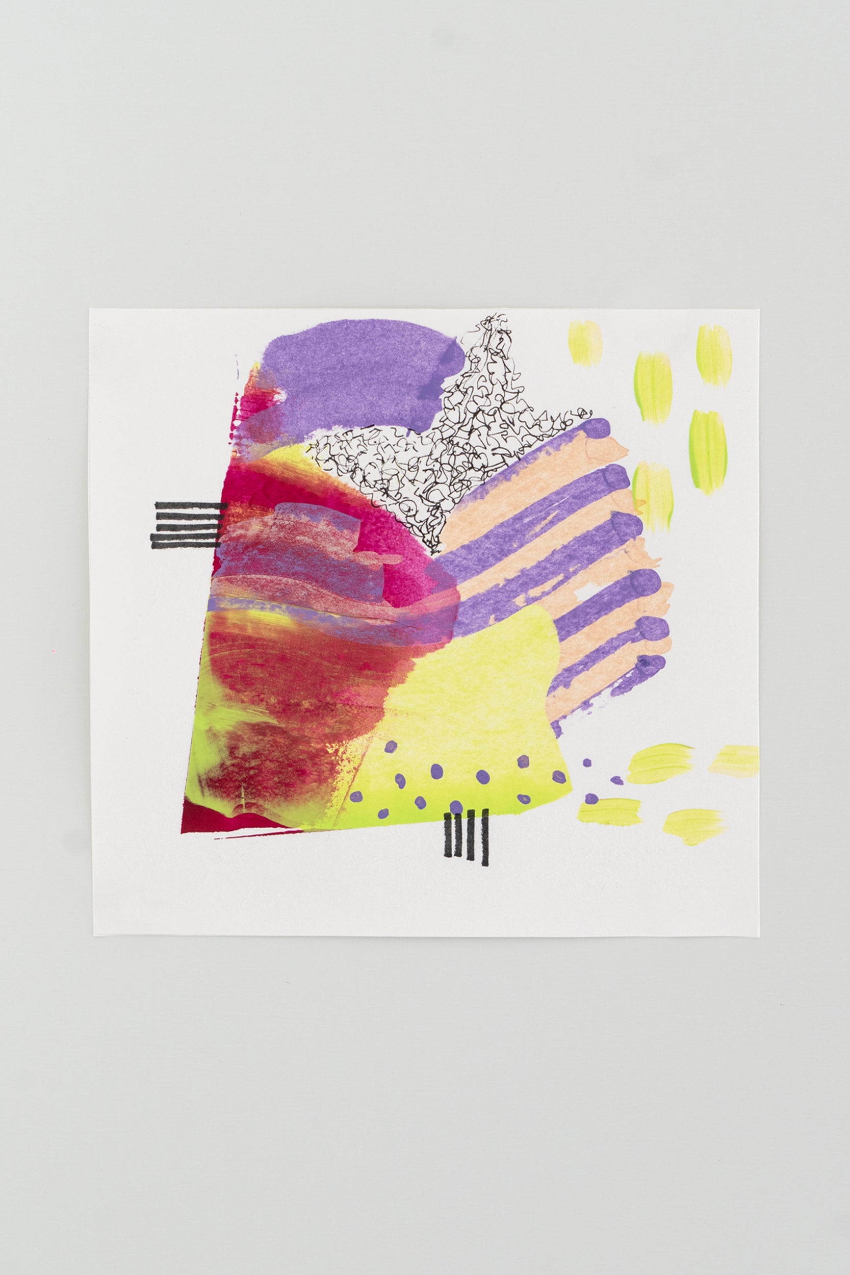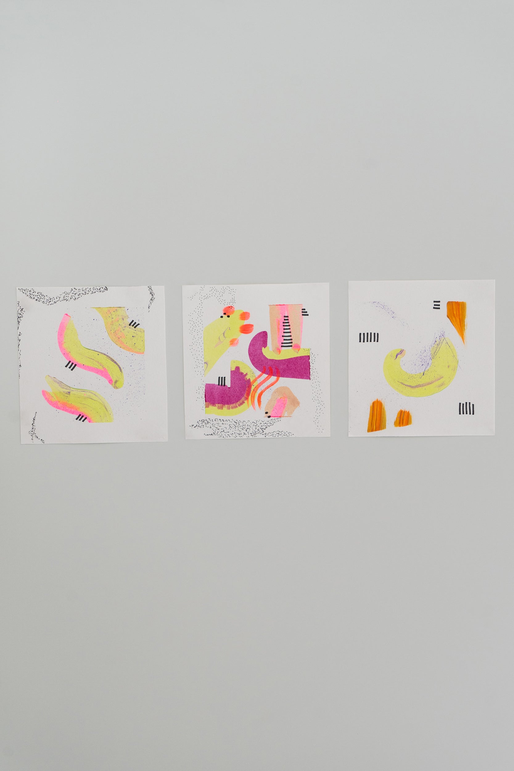 This set of three original abstract acrylic paintings on 250gsm paper combines vibrant neon tones with geometric graphic details, creating a bold and contemporary collection. Each piece measures 15 x 15 cm, offering flexibility for framing as a triptych or displaying individually. The dynamic interplay of neon yellow, bright pink, orange, and purple with hand-drawn black accents gives these works a modern and energetic aesthetic.